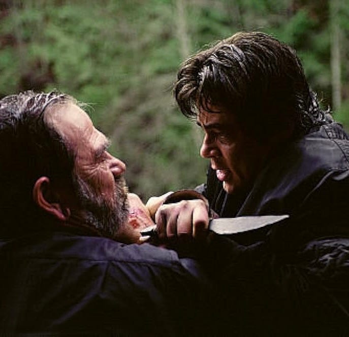 Jones is in full action-movie mode here, even if he wears a tucked-in button-down while leaping and running. The close-quarters knife fights between Del Toro and Jones are genuinely brutal. During the climax, hunter and hunted stalk each other in a forest and take time to make their own knives, one carved from stone, the other a piece of metal heated and hammered. It’s silly. I loved it.