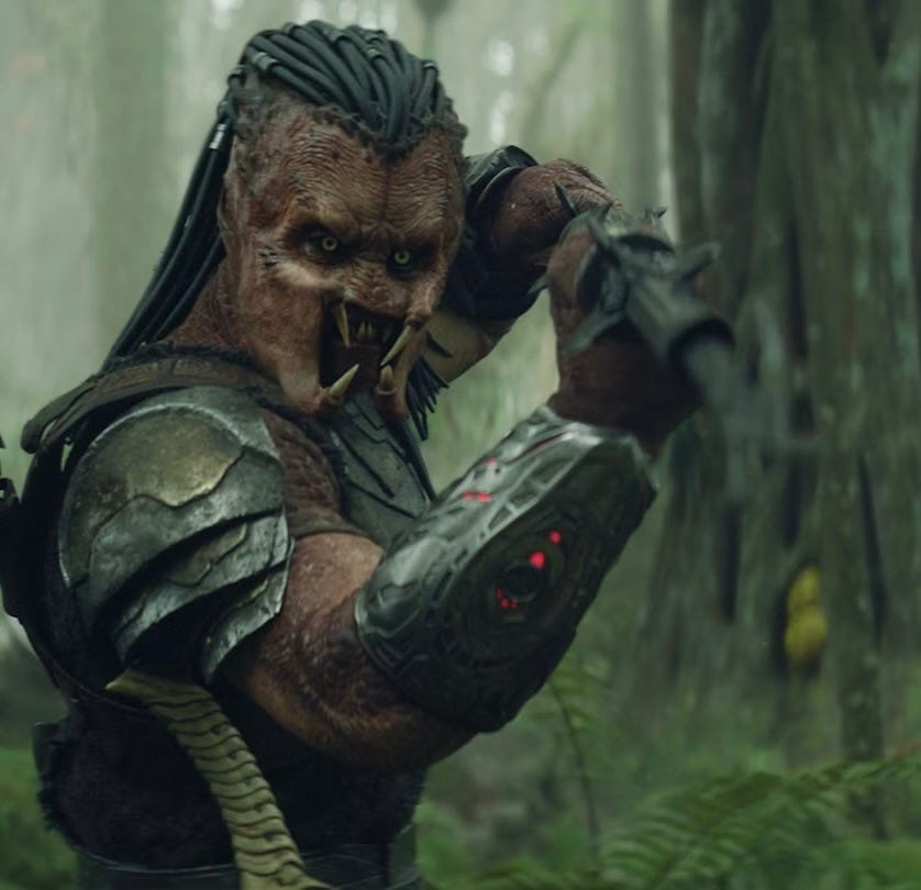 In this movie, Trachtenberg wants to flip the genre script and introduces a scrawny Predator on a revenge mission to hunt a beast on a “death planet” crawling with hungry vines, exploding worms, and pineapples that shoot poison darts.